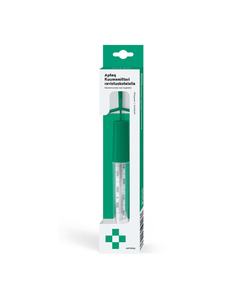 Apteq elavhõbedavaba raputusega termomeeter kehatemperatuuri mõõtmiseks inimesel. Väga kergesti kasutatav ja täpne Hg-vaba termomeeter. Mugav temperatuuri alla lüüa tänu plastikust vutlarile. Desinfitseeritav.