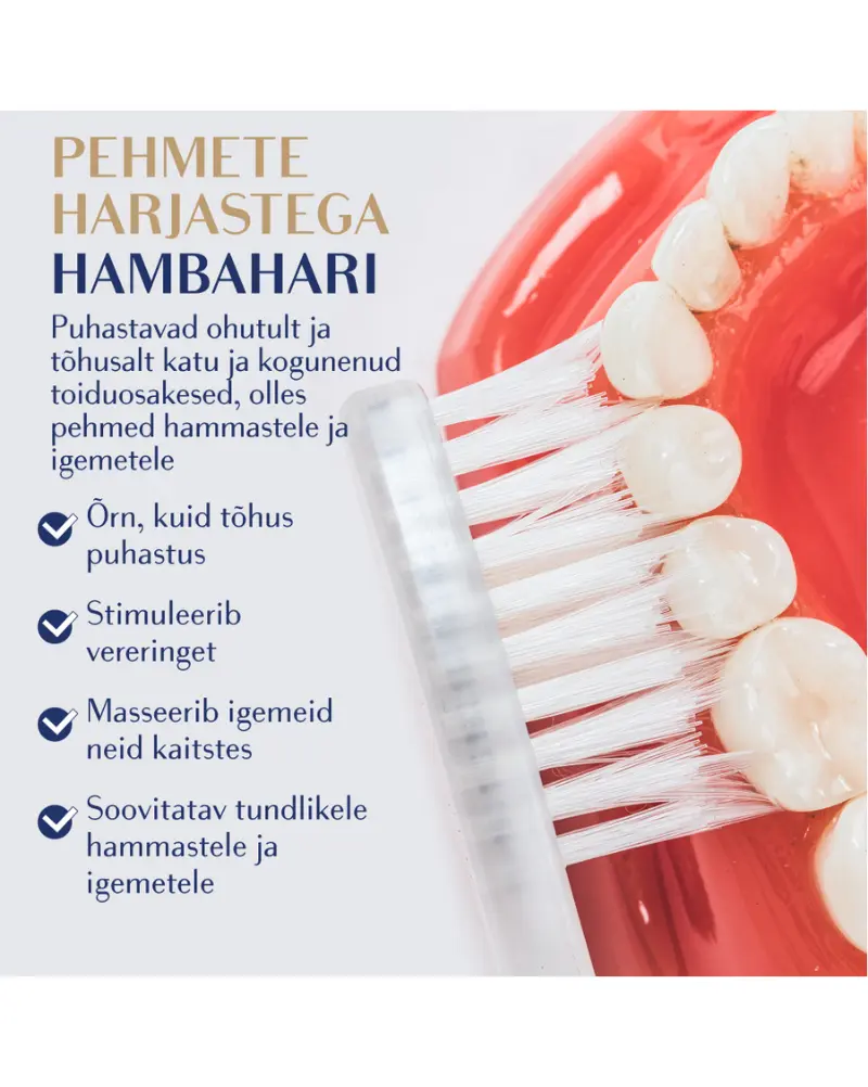 - Ümardatud harjased poleerivad õrnalt hammaste pinda emaili kahjustamata.