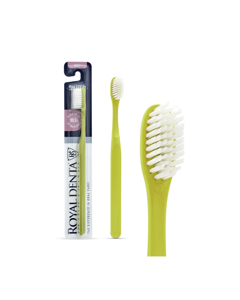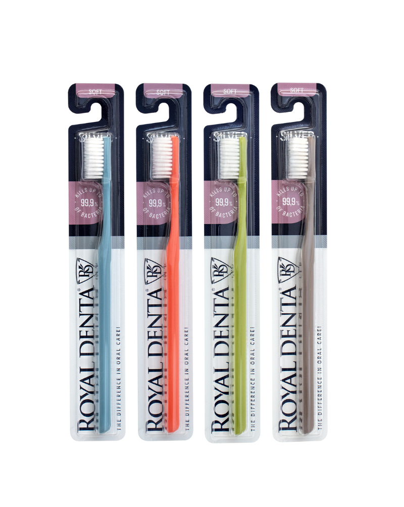 Uue välimusega Royal Denta hambahari pehmete harjastega, mis sisaldavad hõbeda osakesi.