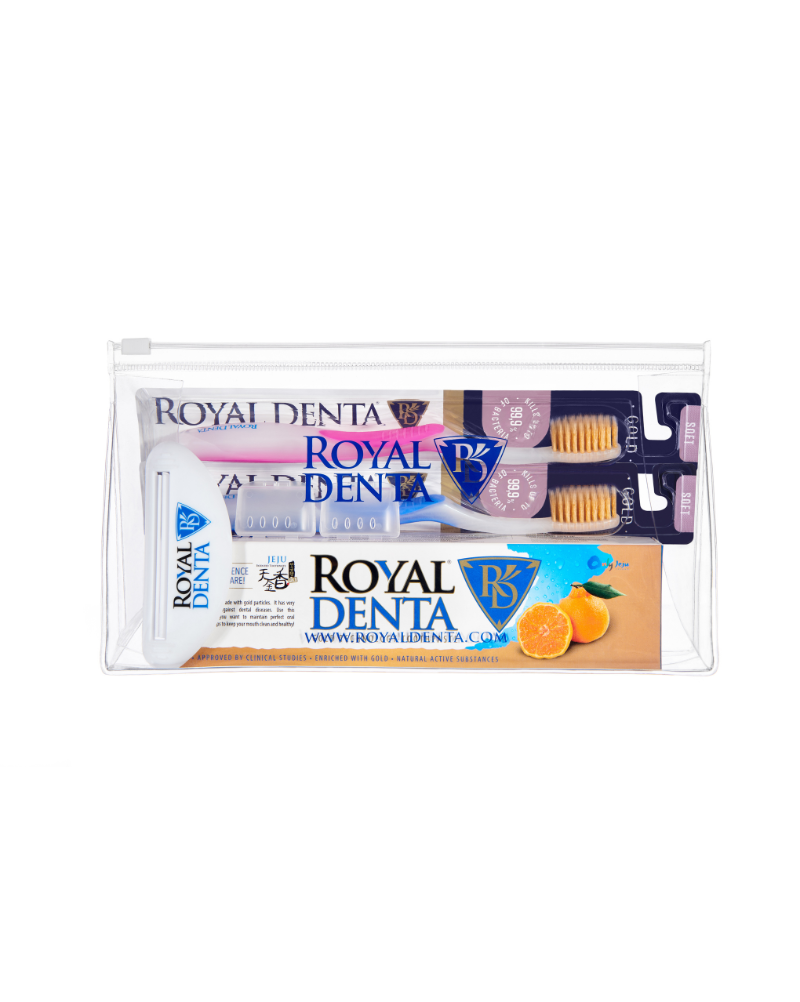 Komplekt sisaldab kahte Royal Denta Soft kullaga hambaharja, Royal Denta Jeju hambapastat 130g, hambapasta tuubi pigistajat, hambaharjade katteid ja kosmeetikakotti.